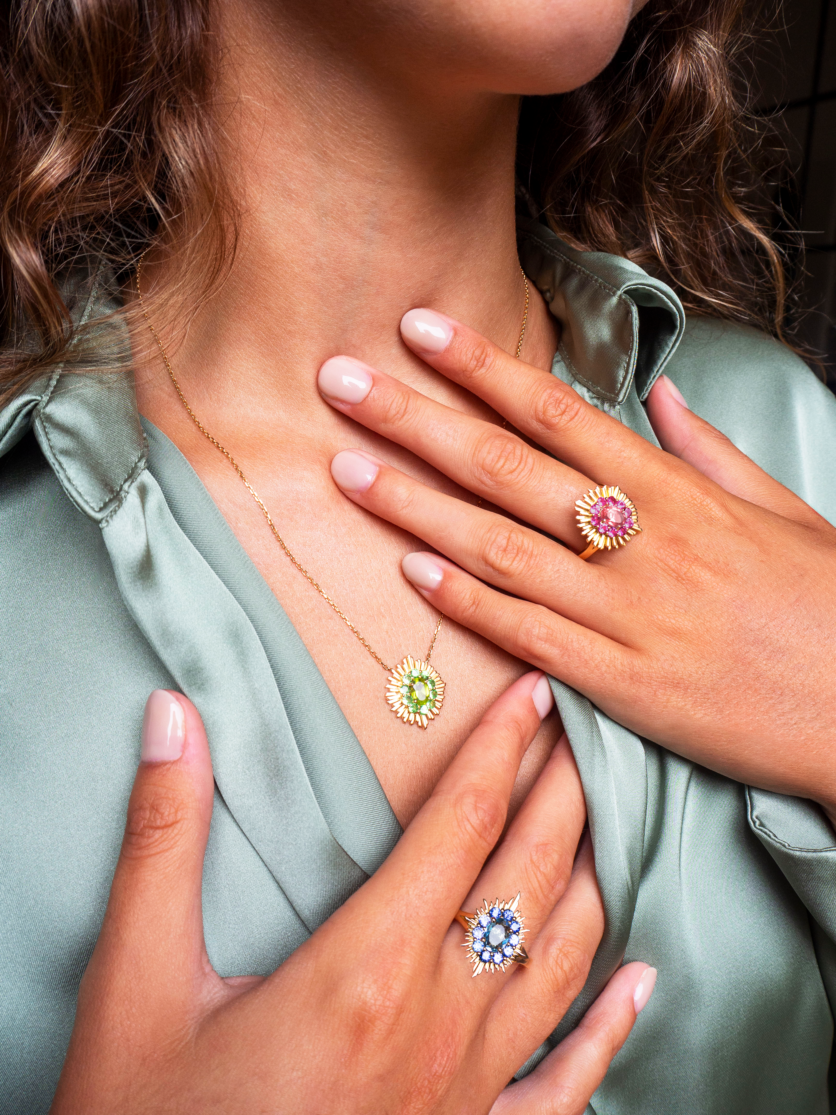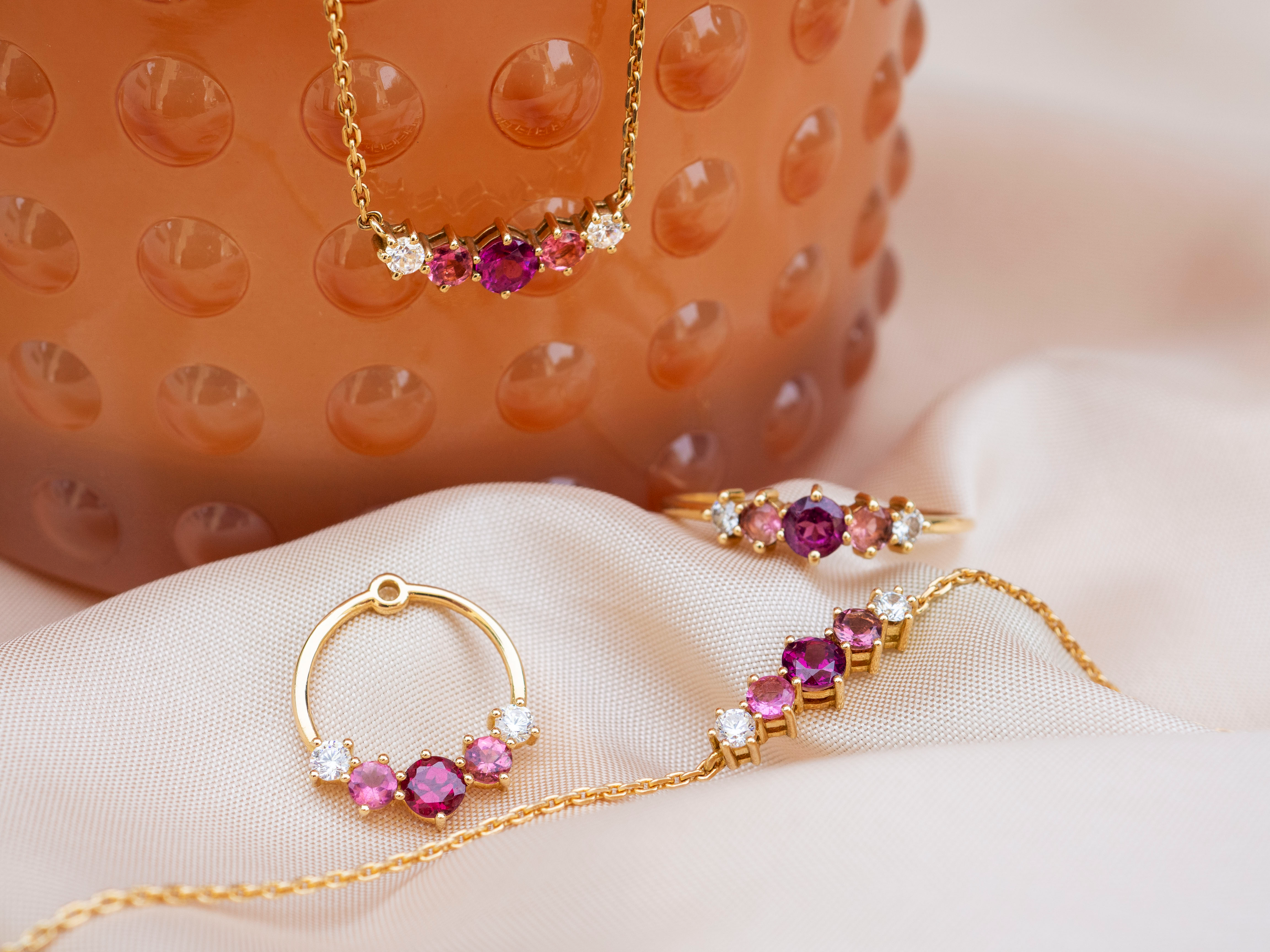 Our jewelry is made from 18-carat recycled gold and set with precious stones and fine stones.