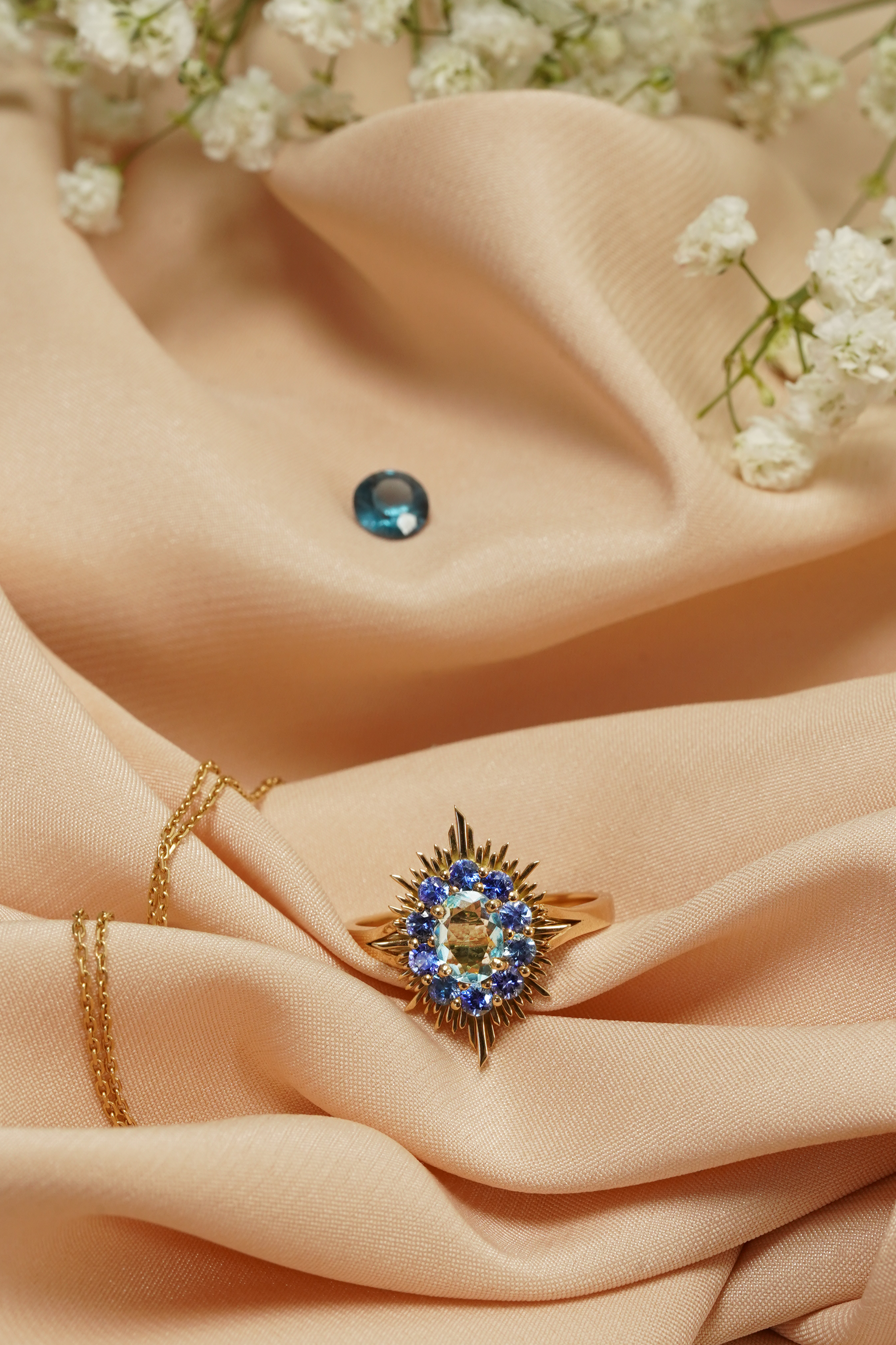 My approach stands out through the use of 18-carat recycled gold and natural gemstones, with production done only upon order to avoid overstock.
